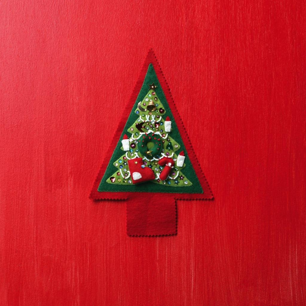 Wallpaper Christmas tree made of fabric on the red wall on Christmas