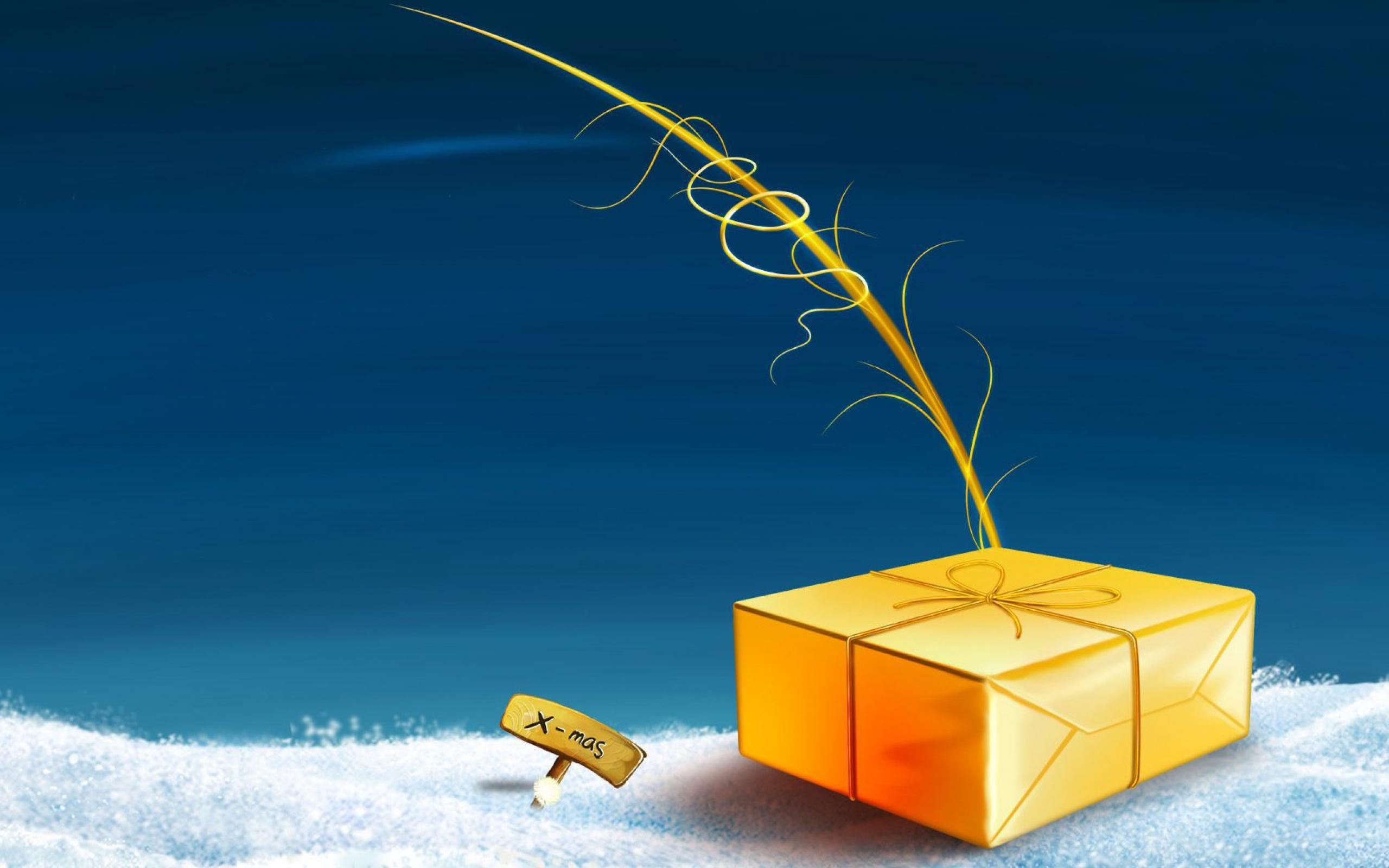 Wallpaper Yellow gift box lies on the snow on Christmas