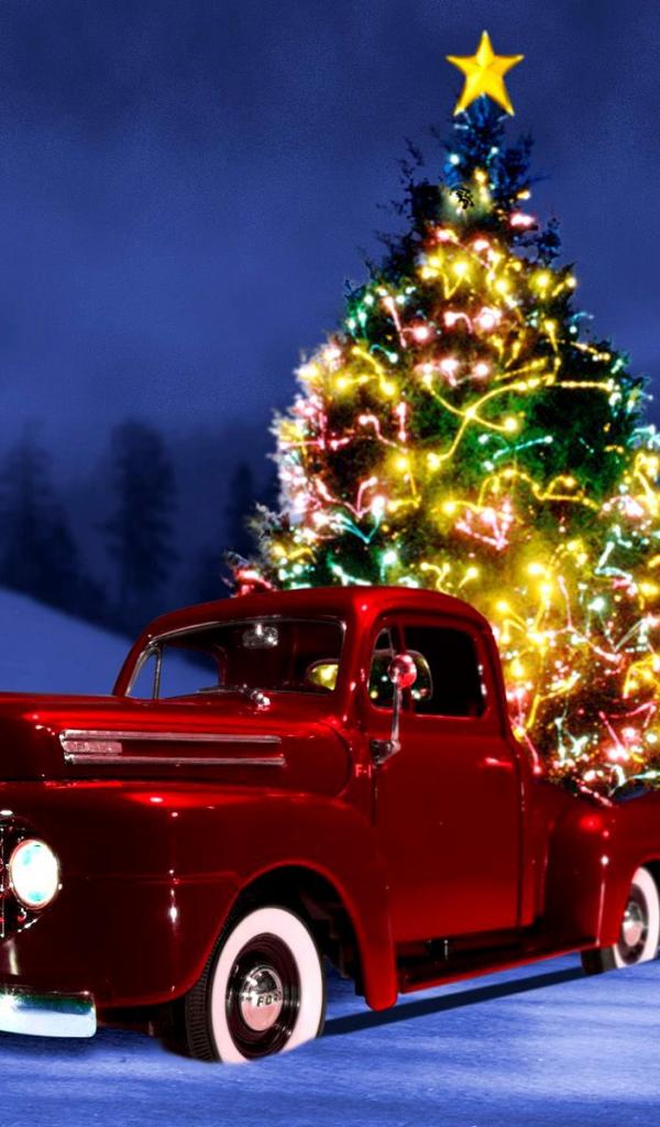 Wallpaper Red car on a background of the Christmas tree on Christmas