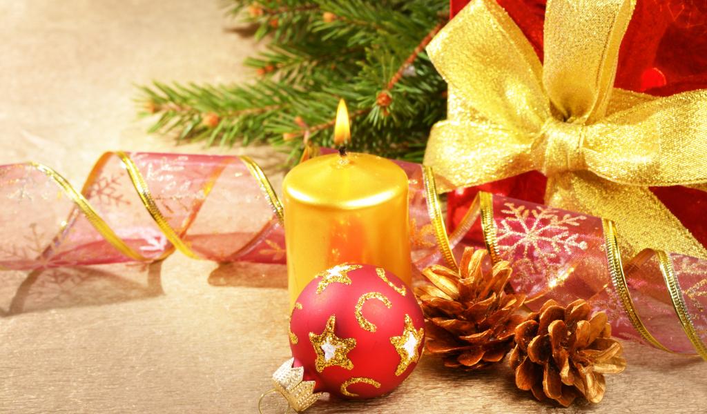 Wallpaper Gift, Red ribbon, A glass of champagne, Balls, Candles , Christmas tree, Santa Claus, Christmas toys, Christmas garland