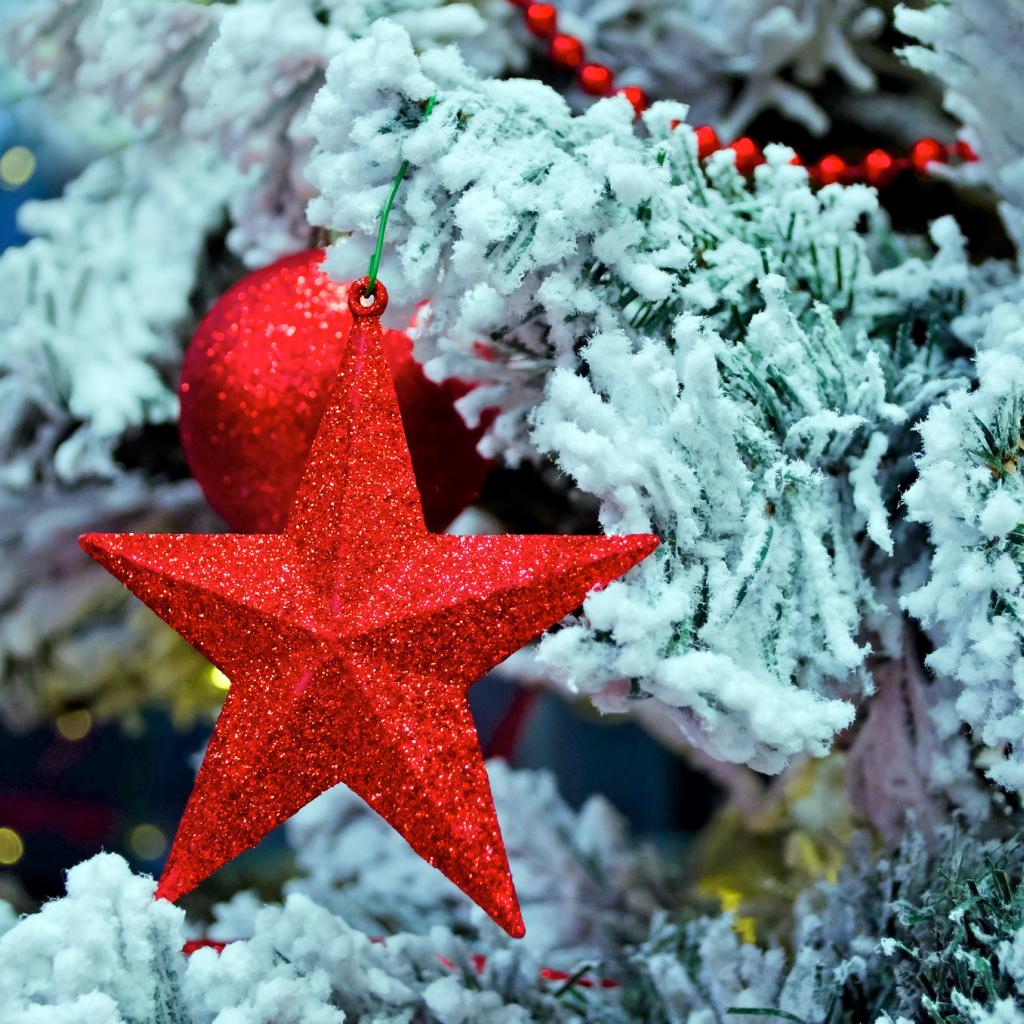 Wallpaper Beautiful Christmas tree with a variety of toys in snowy weather on Christmas