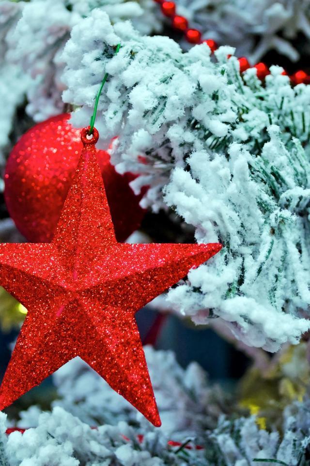 Wallpaper Beautiful Christmas tree with a variety of toys in snowy weather on Christmas