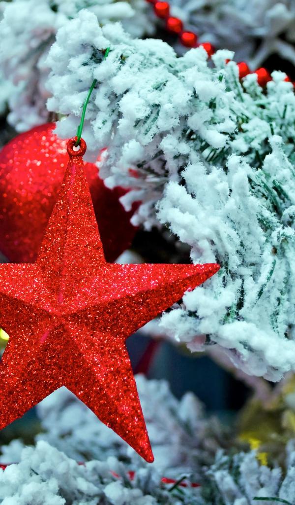 Wallpaper Beautiful Christmas tree with a variety of toys in snowy weather on Christmas