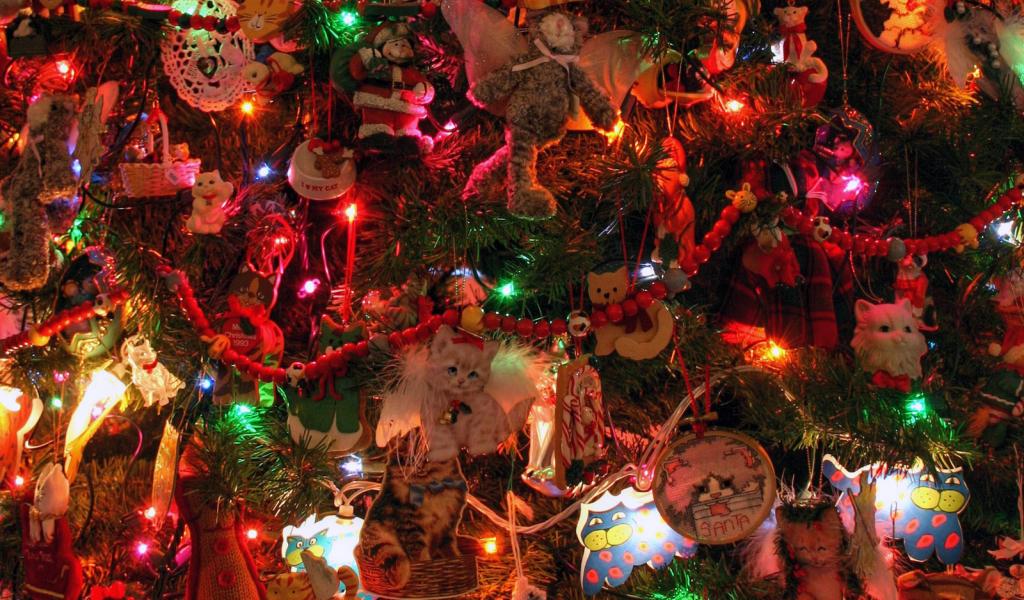 Wallpaper Beautiful Christmas tree with a variety of toys in snowy weather on Christmas