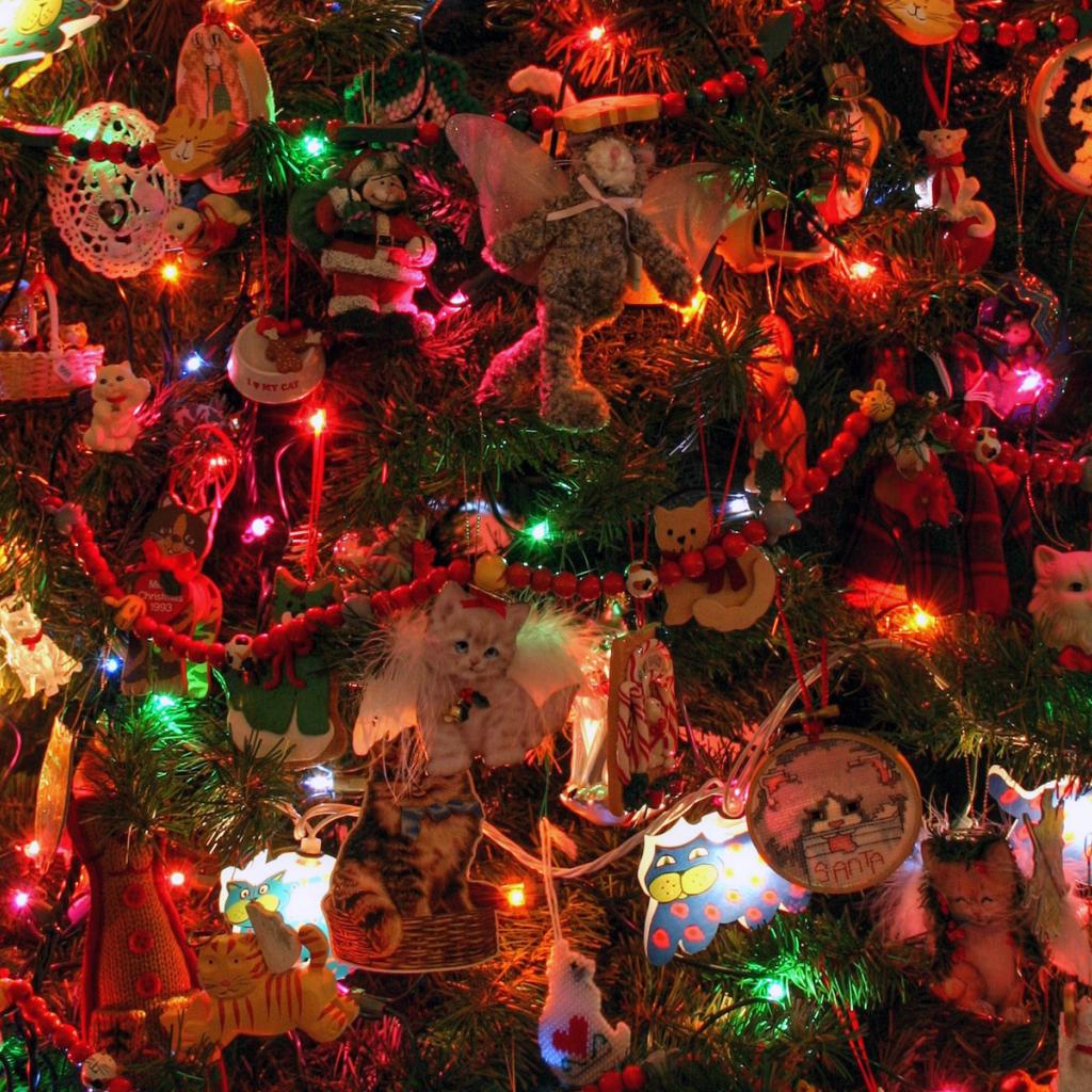 Wallpaper Beautiful Christmas tree with a variety of toys in snowy weather on Christmas