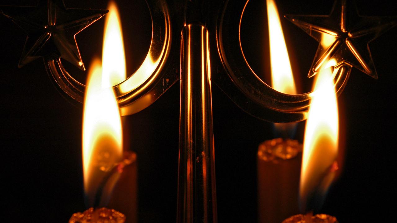 Wallpaper Burning red candles on a background of garlands on Christmas