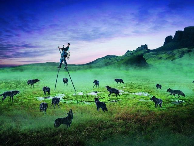 Wallpaper Hunter on stilts and wolves