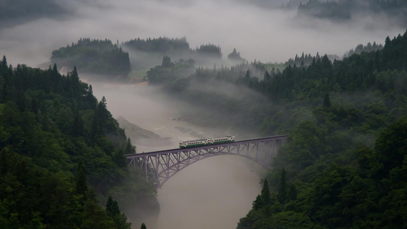 Wallpaper Railway bridge in the form of an arch over the green forest and river