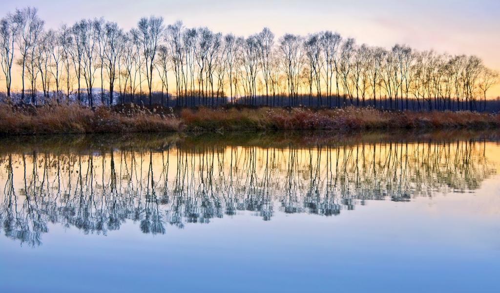 Wallpaper Trees without leaves reflected in water