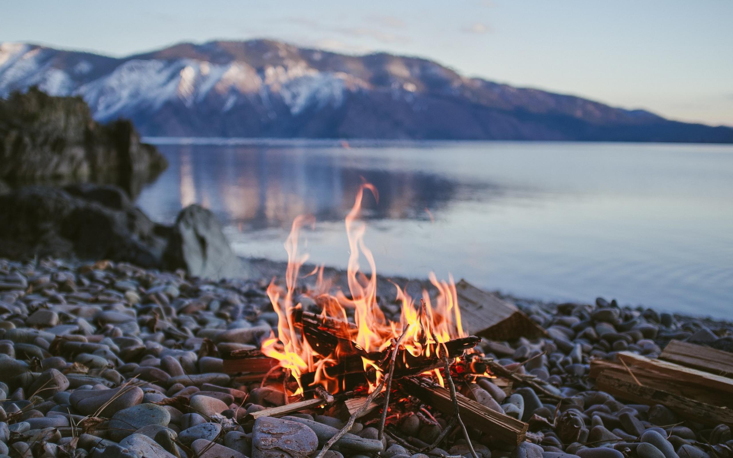 Wallpaper Bonfire on the pebbles on the shore of the lake