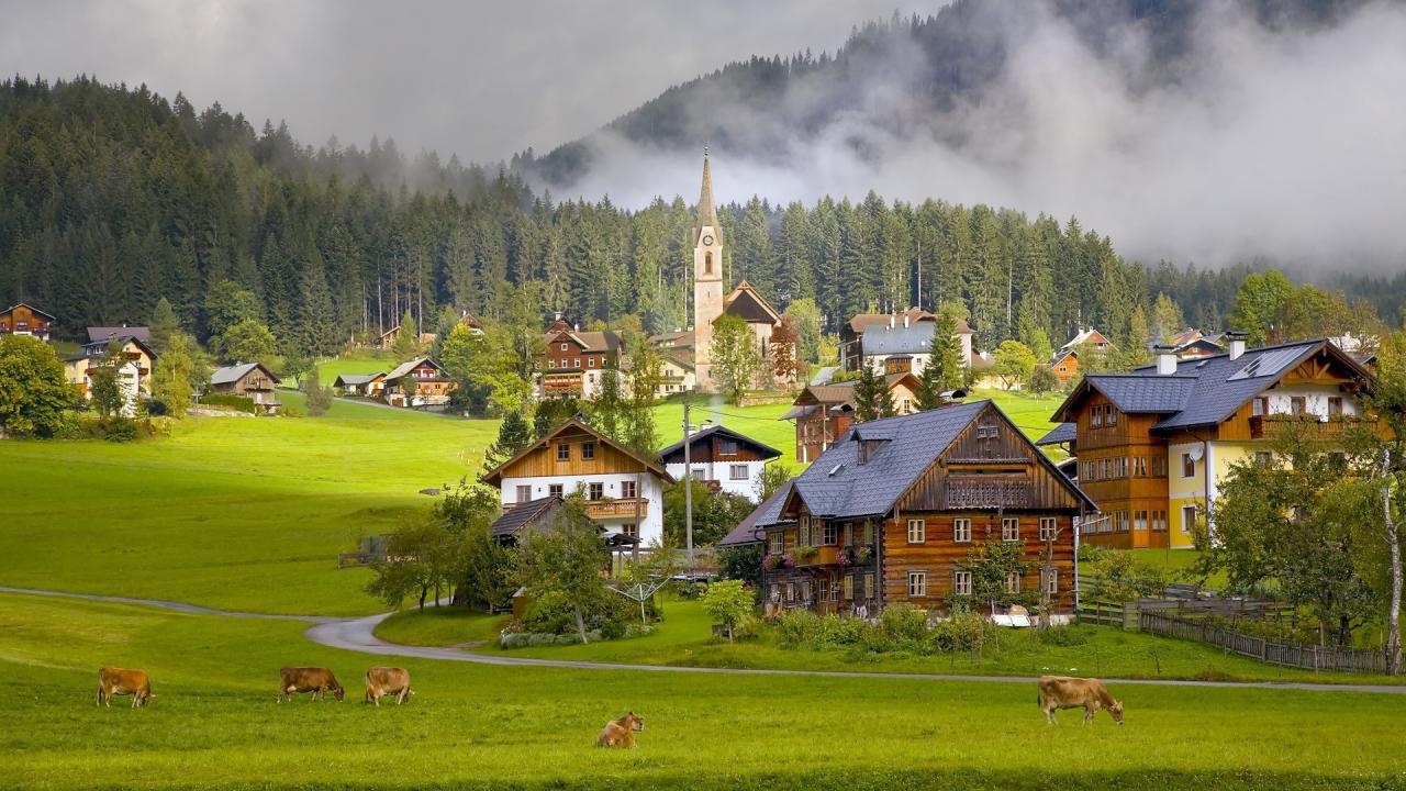 Wallpaper Cows on pasture alpine village