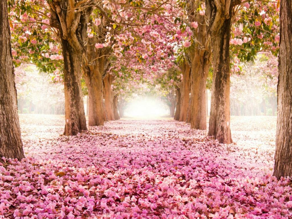 Wallpaper The earth is strewn with flower petals of cherry