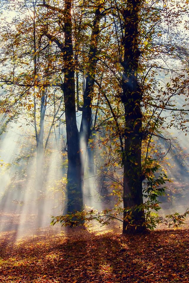 Wallpaper The sun`s rays through the trees in the autumn forest