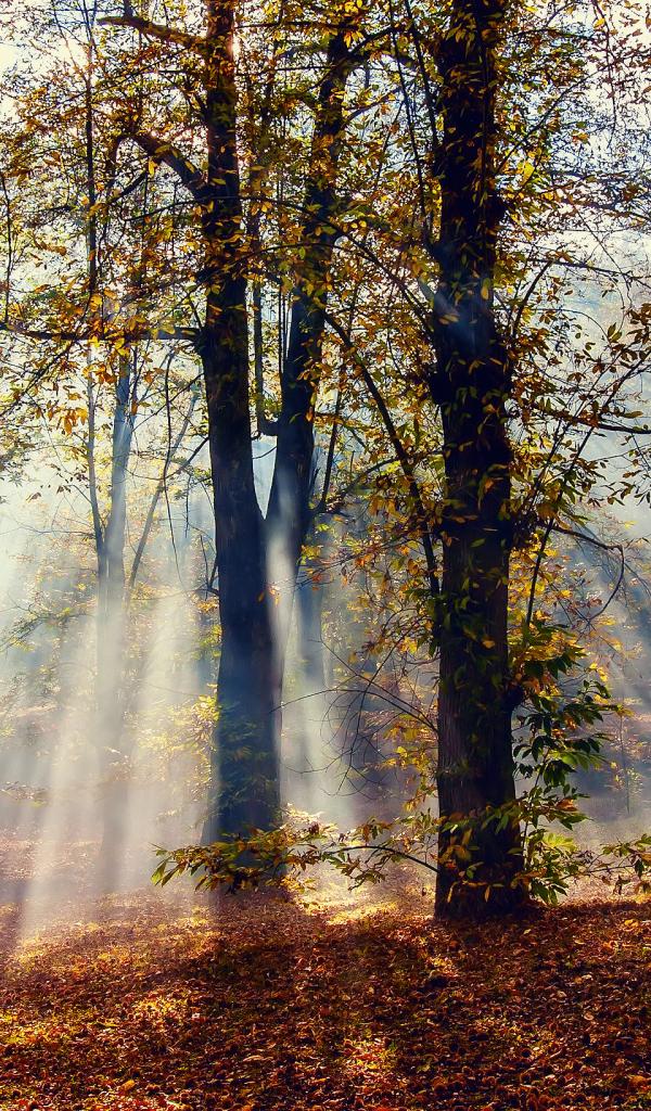 Wallpaper The sun`s rays through the trees in the autumn forest