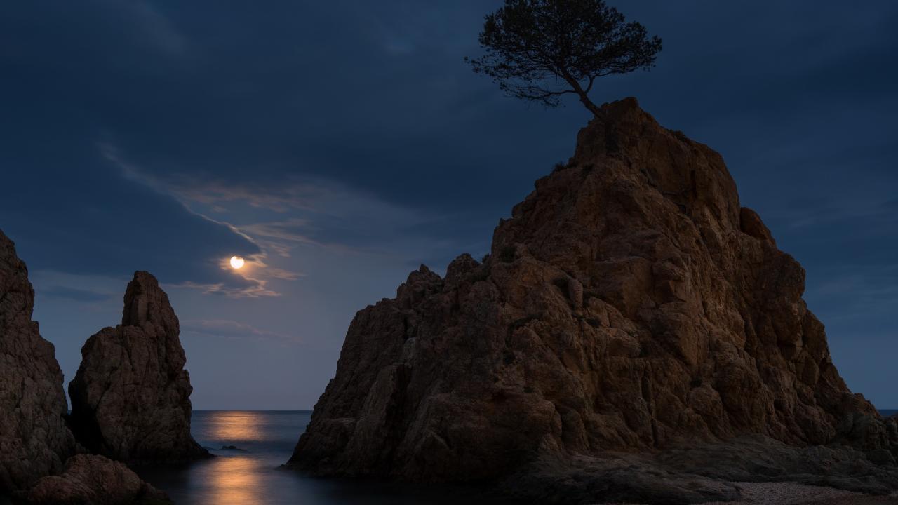 Wallpaper Bare rock near the shore on the background of purple sunset