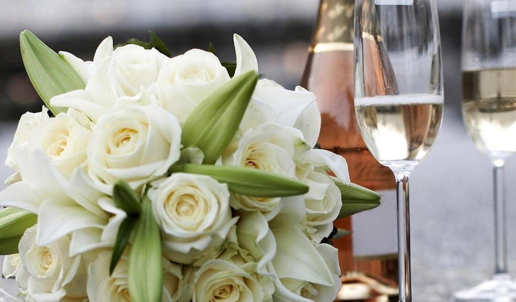 Wallpaper Champagne and a bouquet of roses for his beloved on March 8