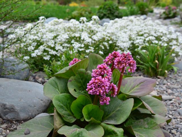 Wallpaper Bergenia beautiful perennial flowers in the forest
