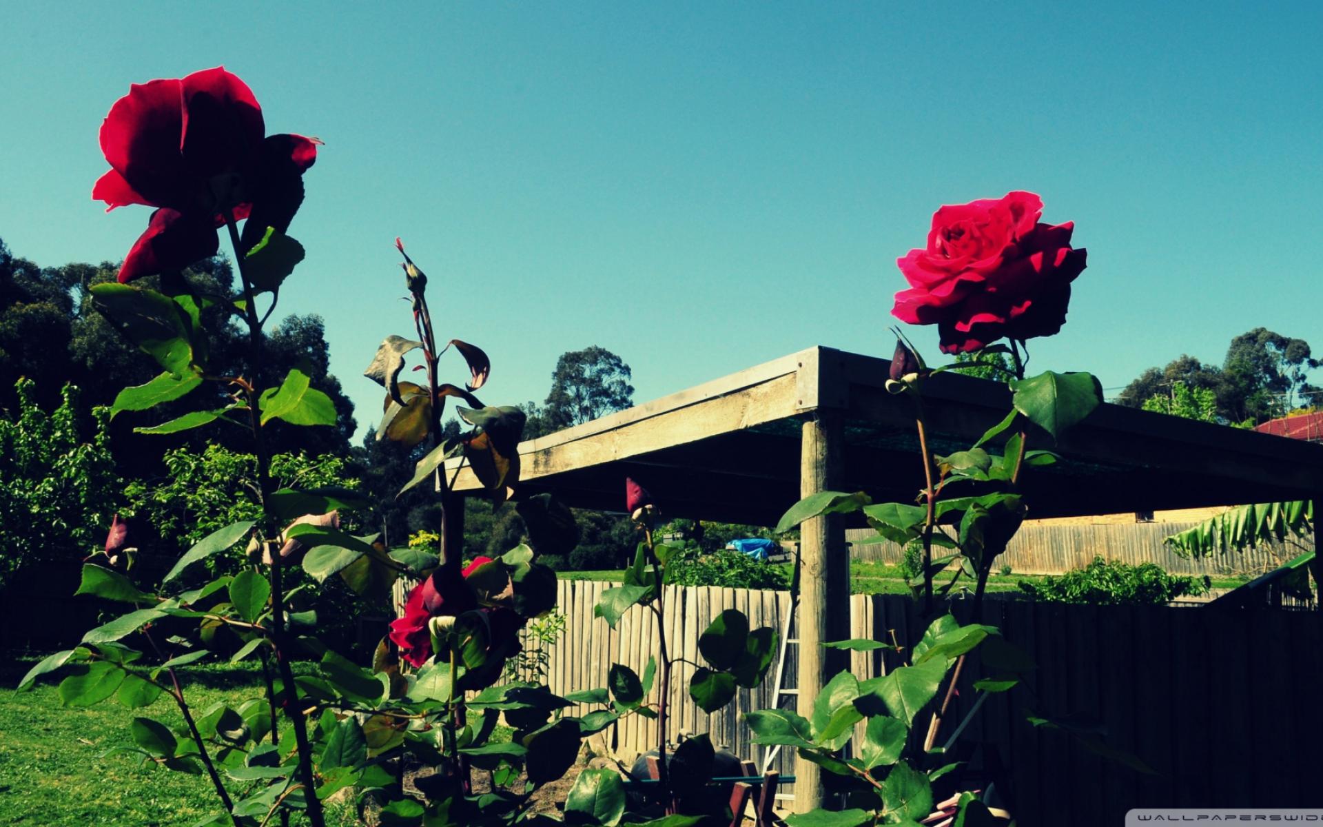 Wallpaper Red roses in the garden on a sky background
