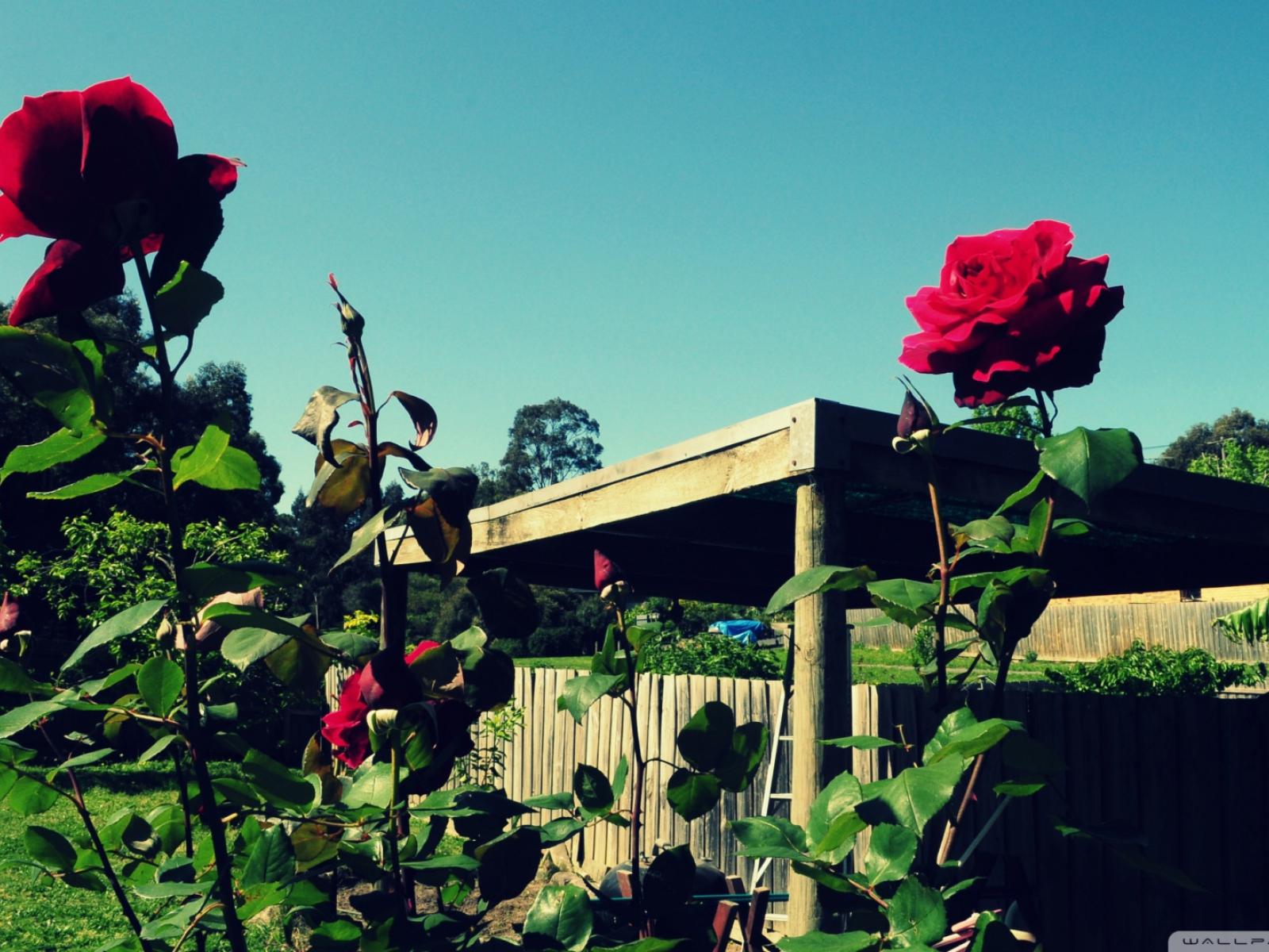Wallpaper Red roses in the garden on a sky background