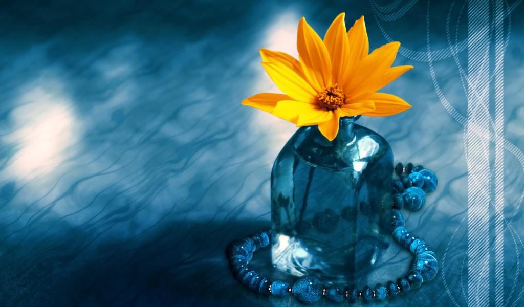 Wallpaper Yellow flower in a blue bottle