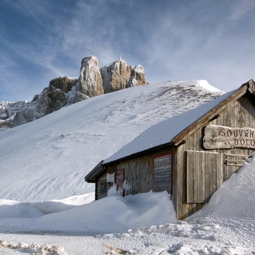 Wallpaper Wooden cottage covered with snow in the mountains