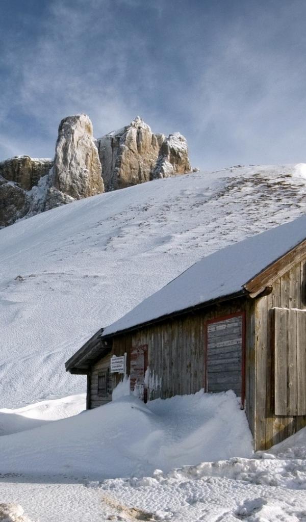 Wallpaper Wooden cottage covered with snow in the mountains