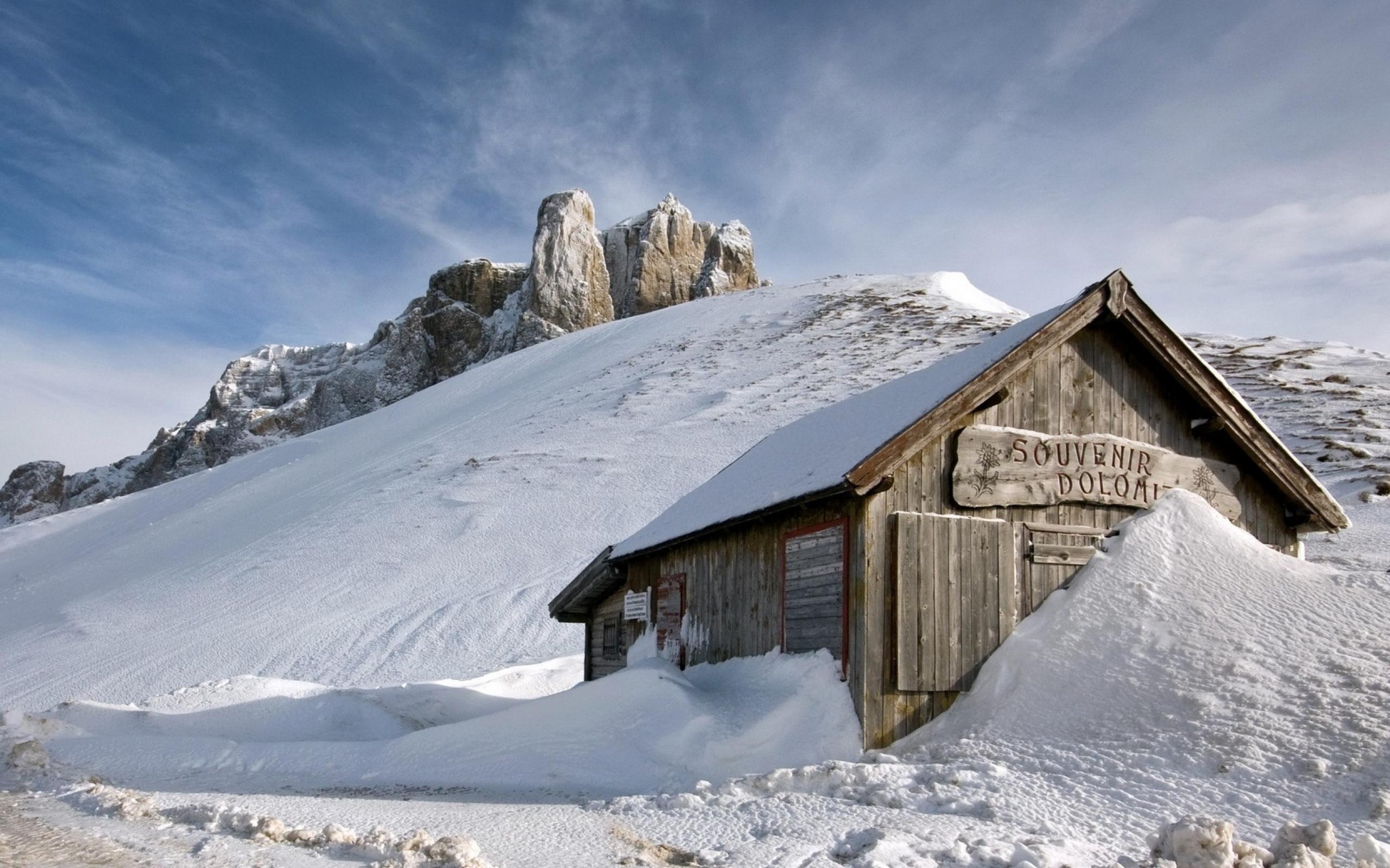 Wallpaper Wooden cottage covered with snow in the mountains