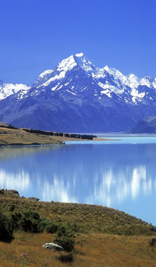 Wallpaper Lake, Snow-capped mountains, Green grass, Reflection, Relax