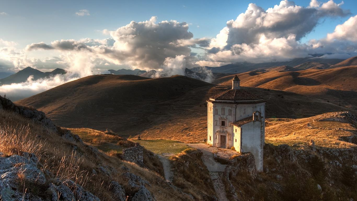 Wallpaper Church on a background of mountains in Ortisei, Italy