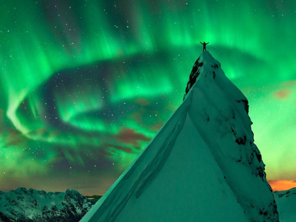 Wallpaper Snowy peak in the background of the Northern Lights