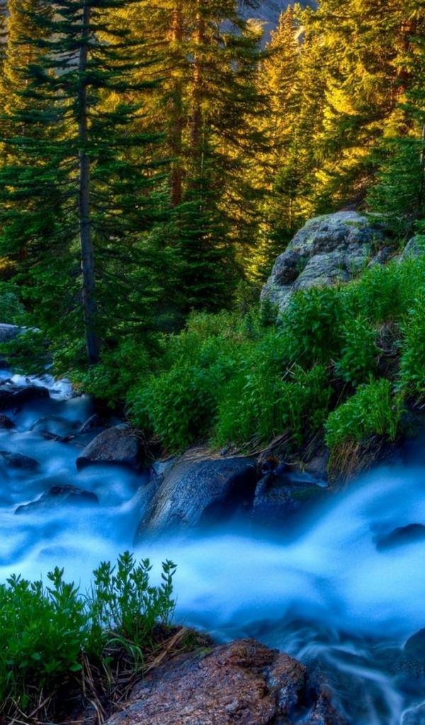 Wallpaper Blue stream among mountain forest