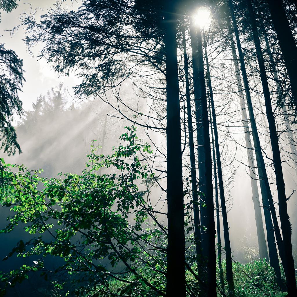 Wallpaper The rays of the sun in a dark pine forest