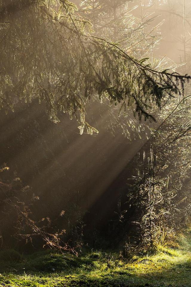 Wallpaper Rays of light in a dense forest