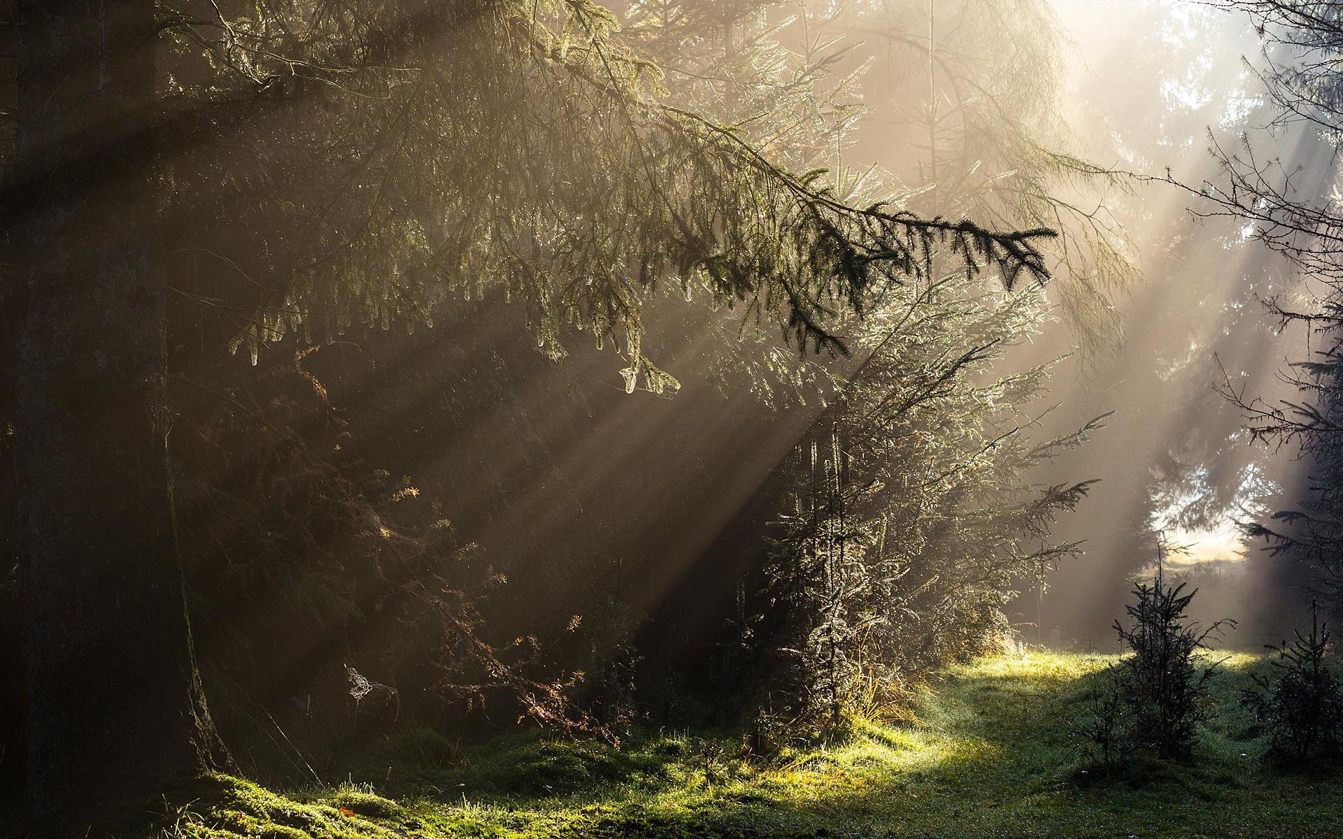 Wallpaper Rays of light in a dense forest