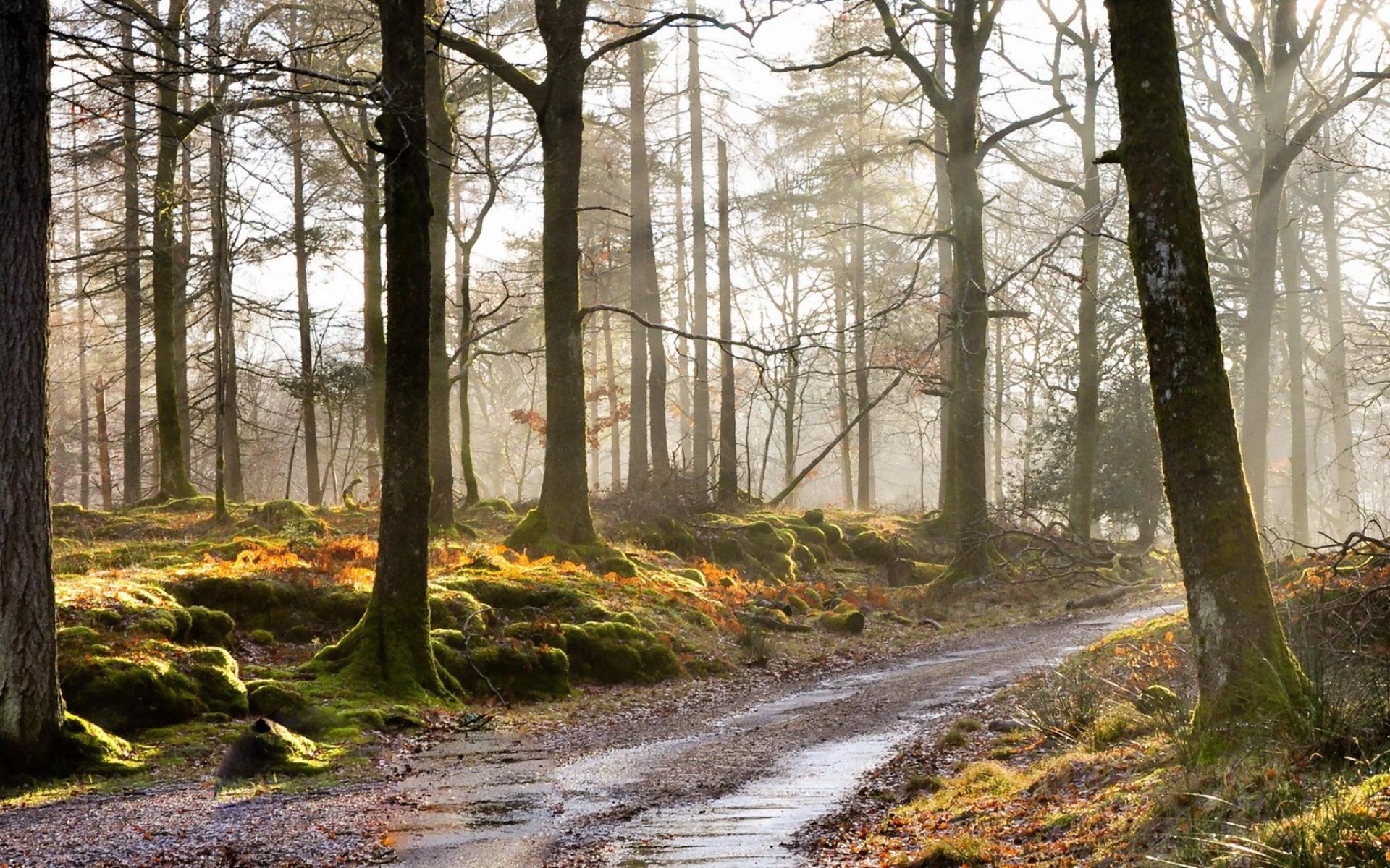 Wallpaper Road in the forest overgrown with moss