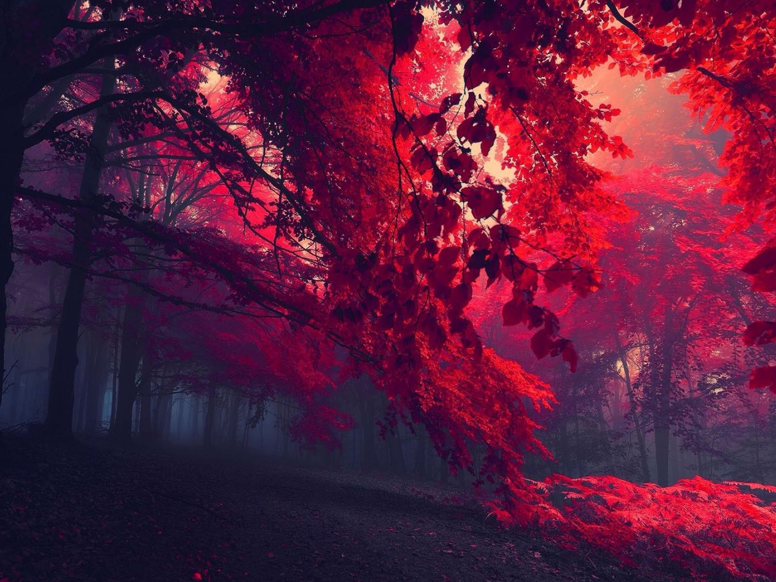 Wallpaper Gloomy forest with red leaves