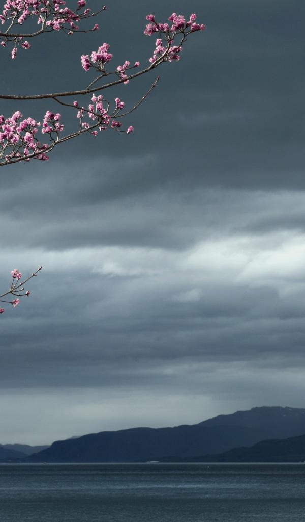 Wallpaper Flowering tree against a background of dark clouds
