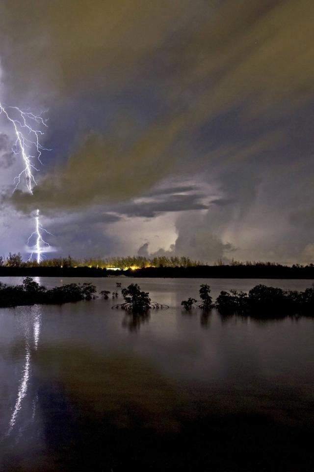 Wallpaper Thunderstorm lightning reflected in the lake