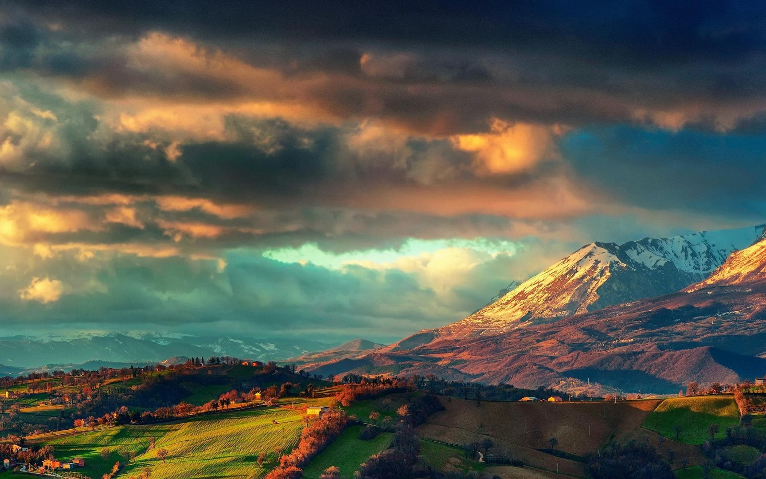 Wallpaper Cumulus clouds over the countryside in the mountains