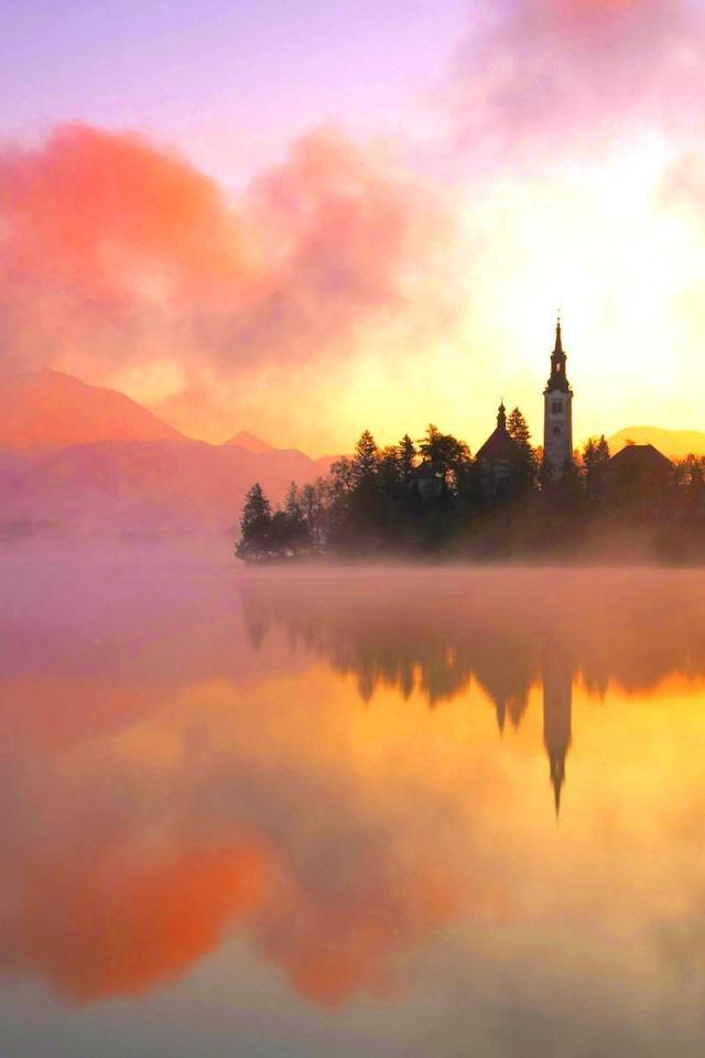 Wallpaper Island on the lake in the fog