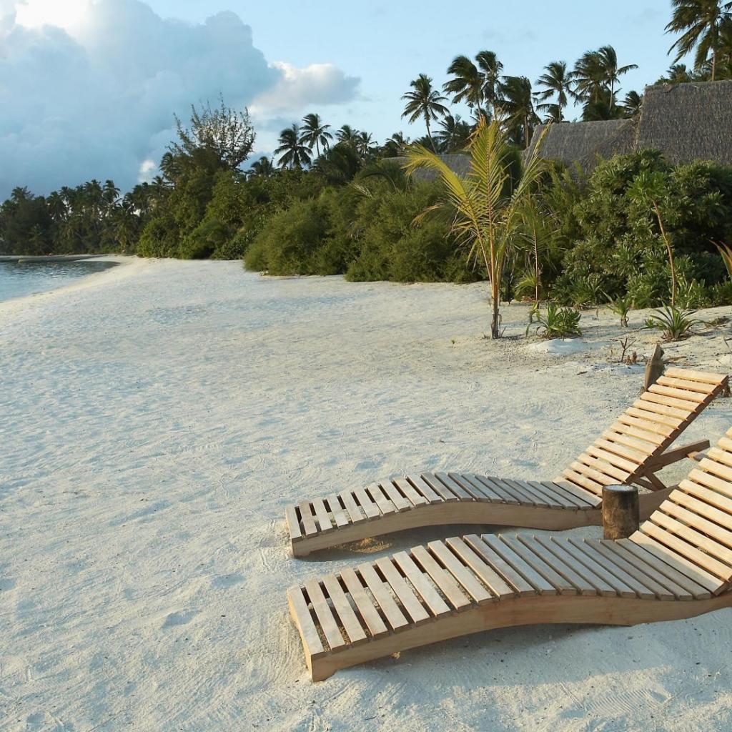 Wallpaper Wooden deck chairs on white sand beach