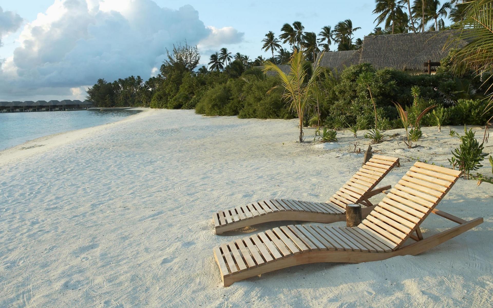 Wallpaper Wooden deck chairs on white sand beach
