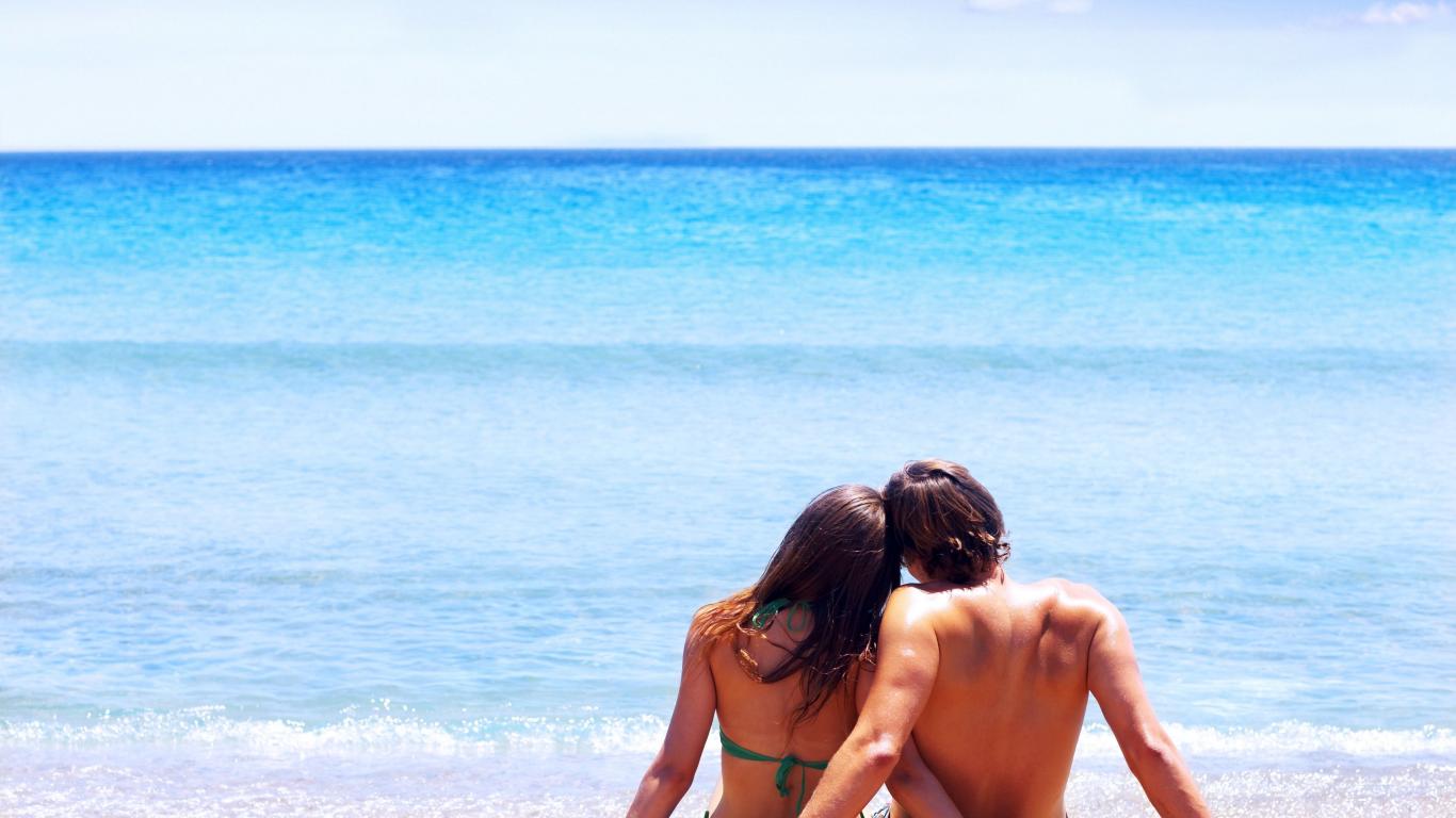 Wallpaper A woman and her daughter sitting in the sand on the beach
