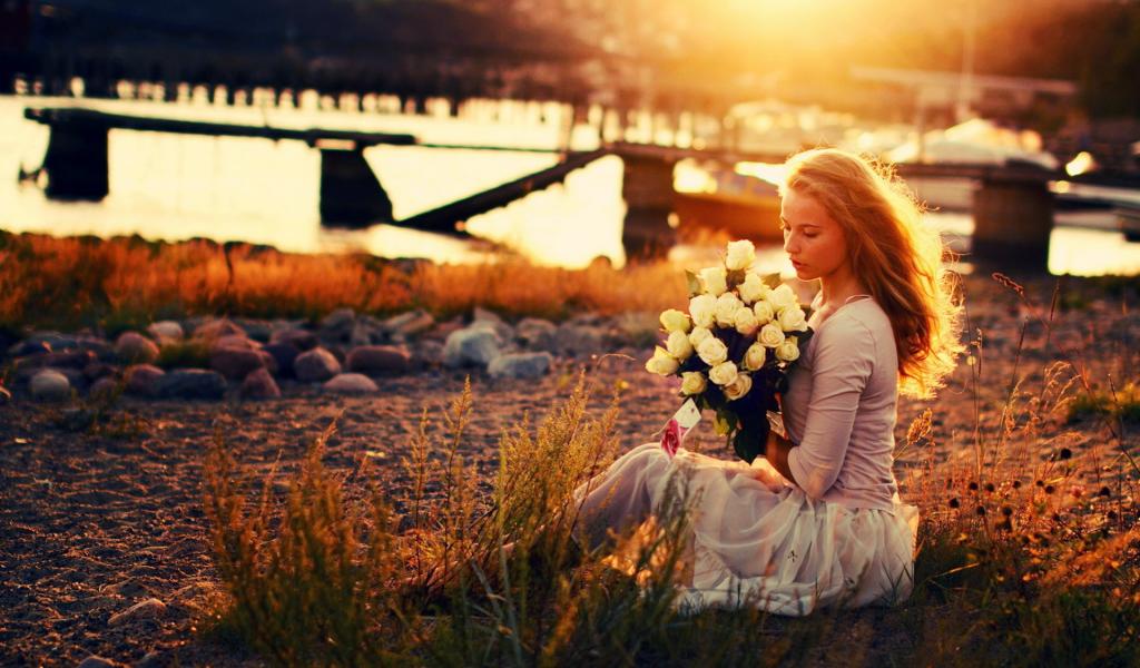 Wallpaper The girl on the nature with a bouquet of roses