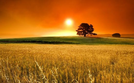 Wallpaper A field of wheat under the orange sky