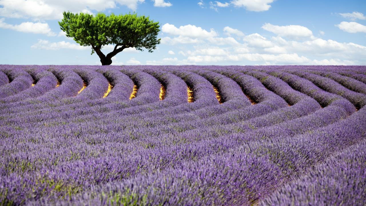Wallpaper Green tree among a field of lavender