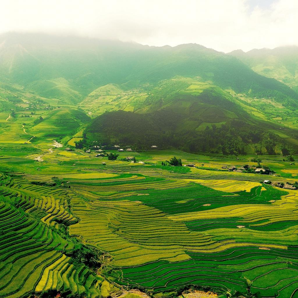 Wallpaper Green fields in a mountain valley