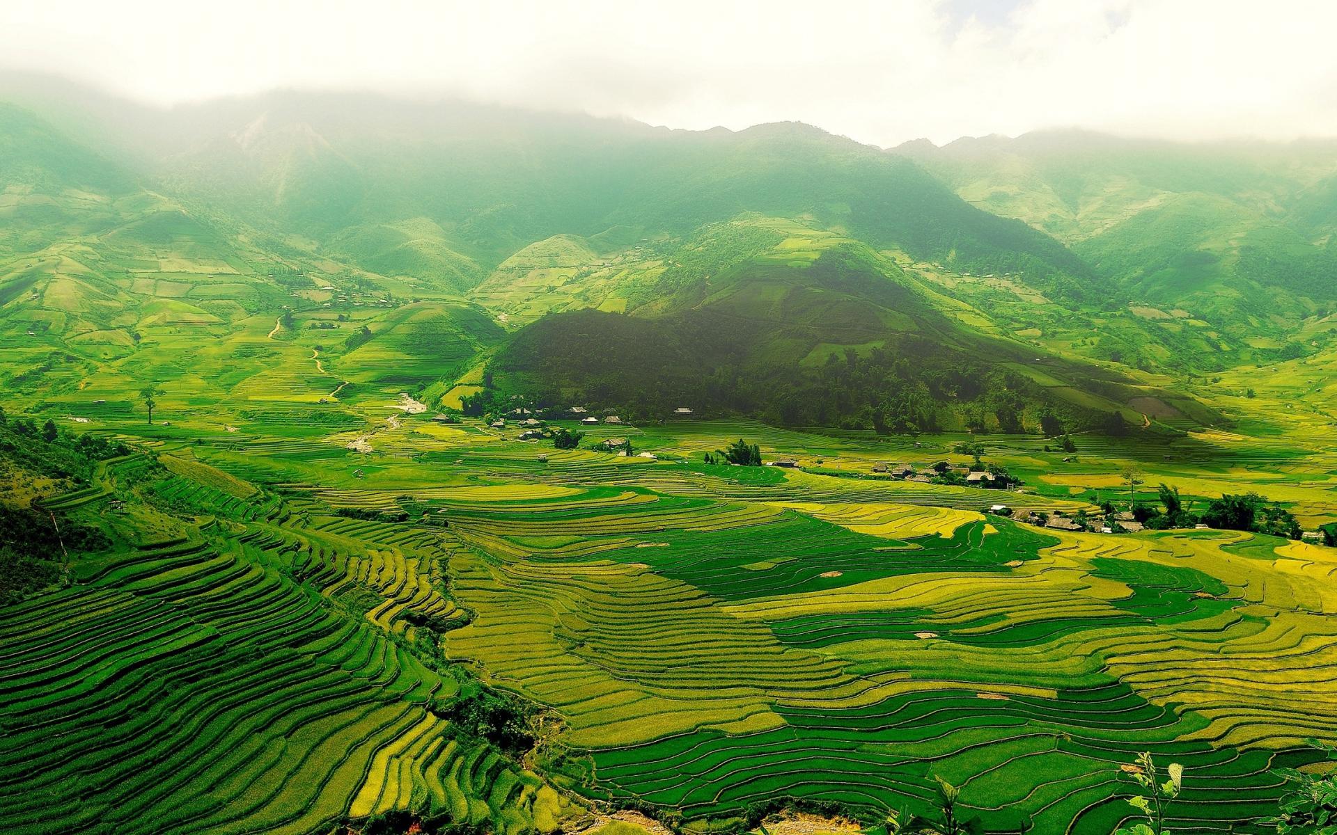 Wallpaper Green fields in a mountain valley