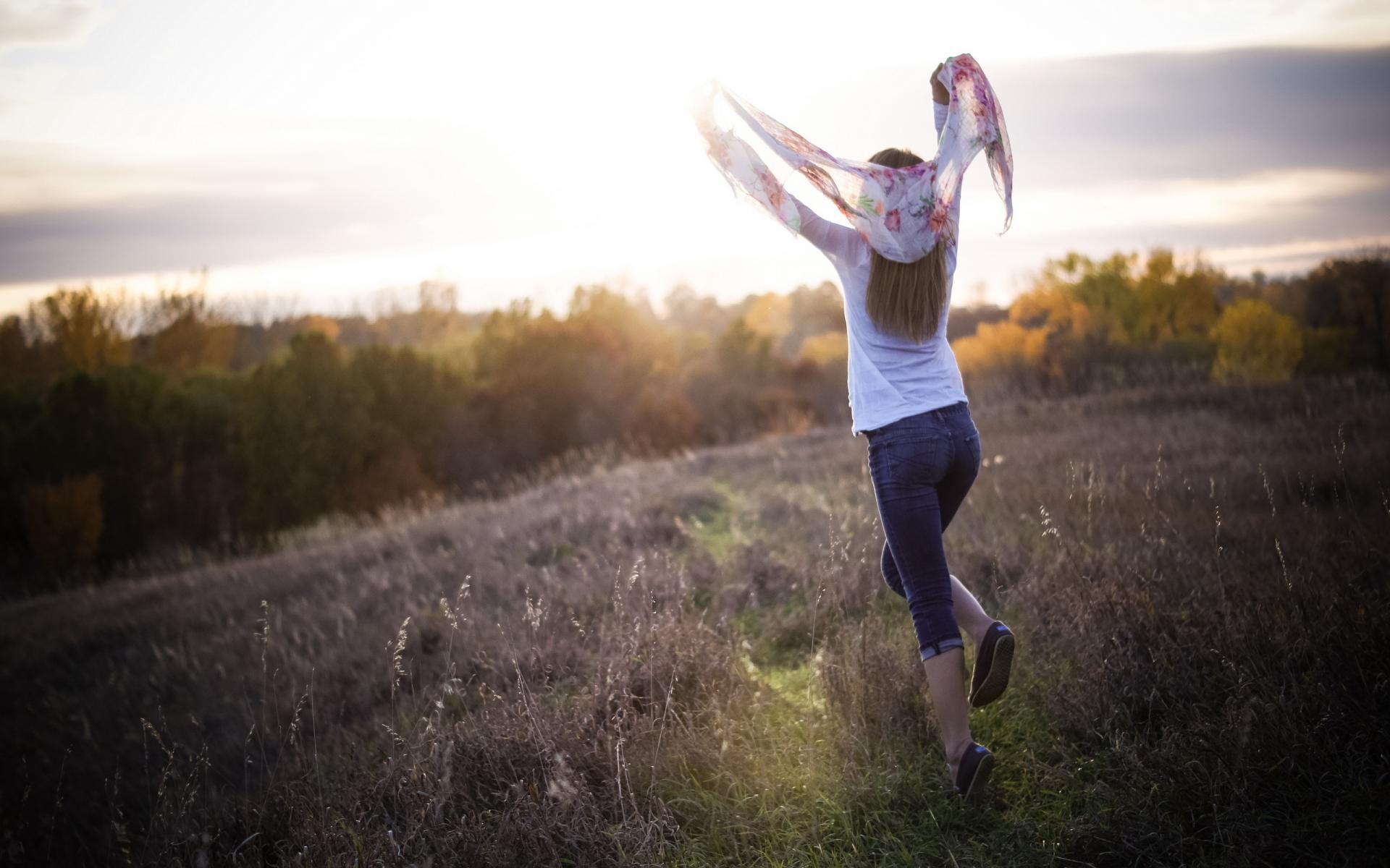 Wallpaper Girl with a scarf ran across the field
