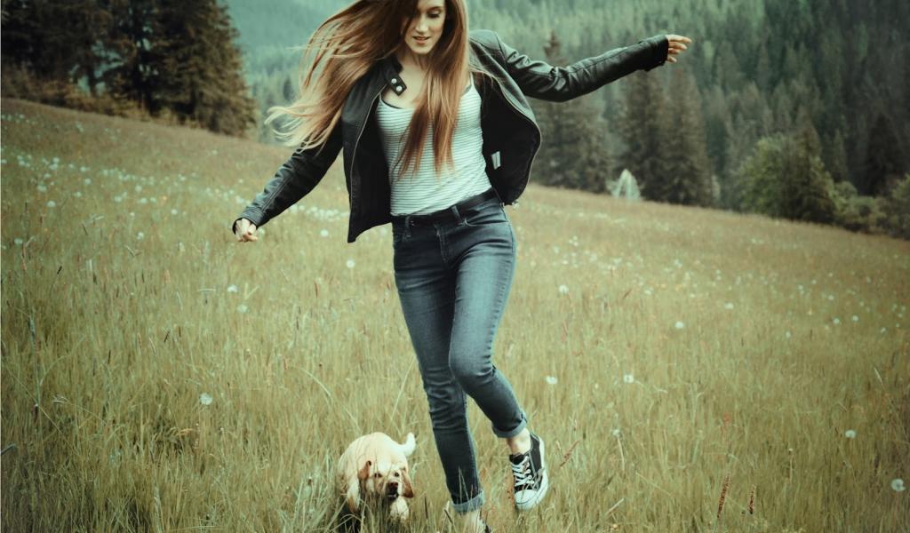 Wallpaper Brunettes dogs fields nature women wallpaper